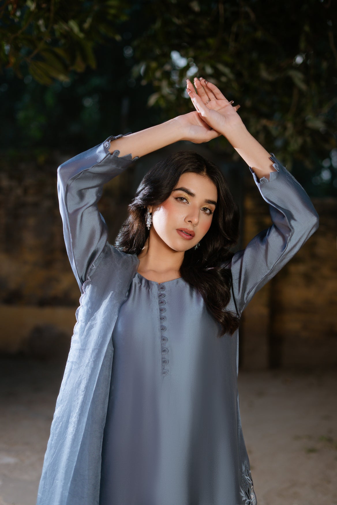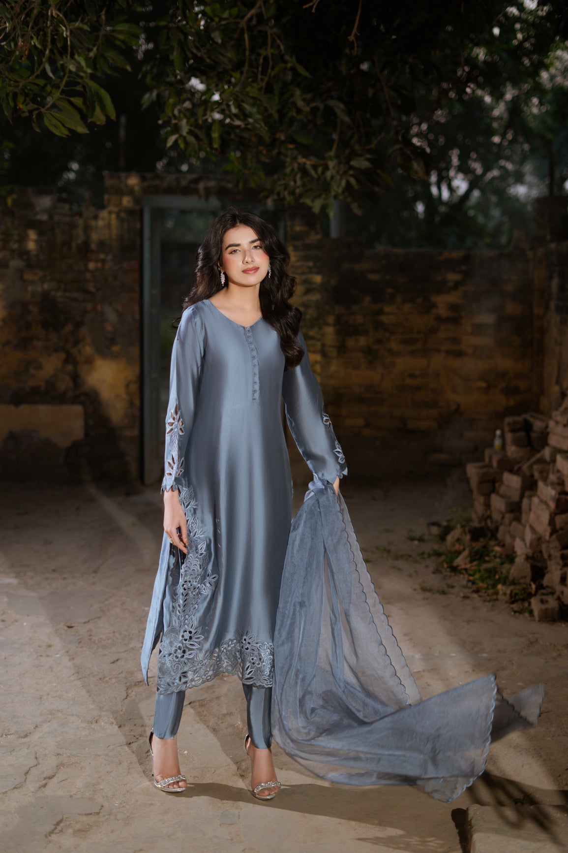 Ethereal and refreshingly elegant, AkS from the Dastak Luxury Collection is a vision in grey. Crafted from pure tissue silk, the loose-fit shirt features intricate cutwork embroidery and a delicately hand-embellished neckline. It is paired with sleek pure tissue silk cigarette pants and a three-yard cutwork organza dupatta. The exquisitely embroidered front, sleeves, and statement dupatta come together to create an outfit that embodies effortless grace, softness, and timeless sophistication.