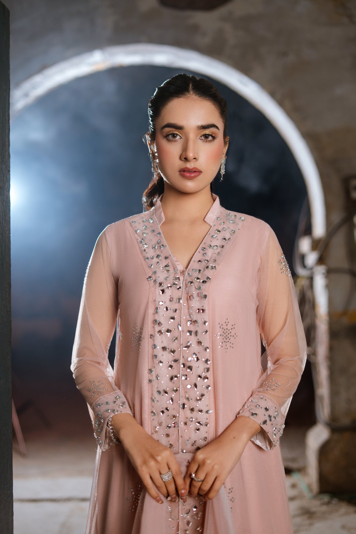 A glimpse of Chandni—this stunning soft pink ensemble from our luxury collection Dastak is a true embodiment of elegance and grace. The net frock is adorned with intricate crystal work throughout and is paired with a smooth tassel silk inner for a refined finish. Designed with a contrasting color band and a beautifully crafted V-neckline, the short frock features a stylish front cut that adds a modern edge. It is complemented by a luxuriously flared sharara crafted from tassel silk, offering graceful movement and volume. The net dupatta is thoughtfully designed with multiple panels, creating a majestic flare that enhances the overall silhouette. Perfect for festive celebrations and formal occasions, Chandni blends timeless charm with contemporary sophistication.