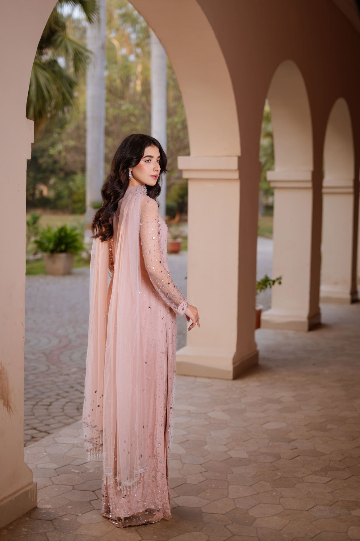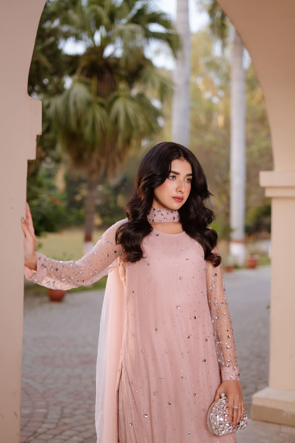 A glimpse of Noor—this stunning soft pink ensemble from our luxury collection Dastak is a true embodiment of elegance and grace. The net frock is adorned with intricate crystal work throughout and is paired with a smooth tassel silk inner for a refined finish. Designed with a contrasting color band and a beautifully crafted V-neckline, the short frock features a stylish front cut that adds a modern edge. It is complemented by a luxuriously flared sharara crafted from tassel silk, offering graceful movement and volume. The net dupatta is thoughtfully designed with multiple panels, creating a majestic flare that enhances the overall silhouette. Perfect for festive celebrations and formal occasions, Chandni blends timeless charm with contemporary sophistication.