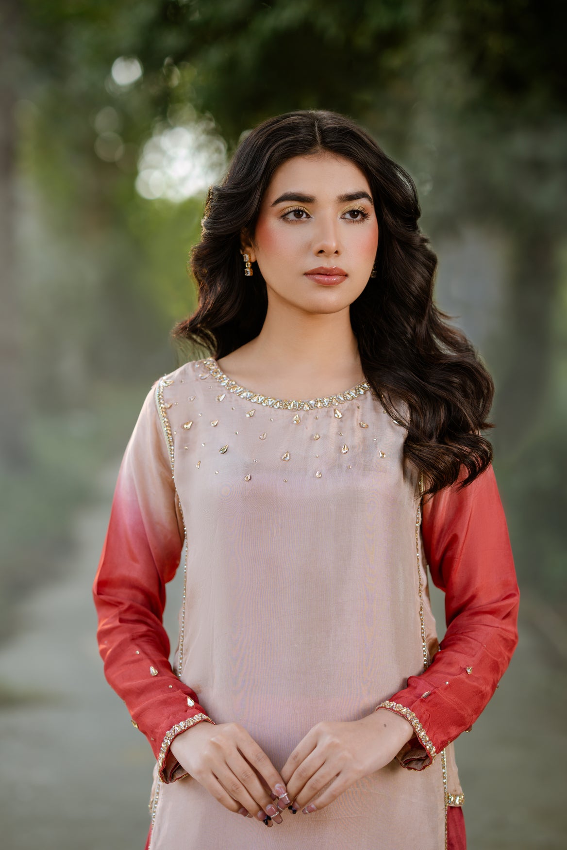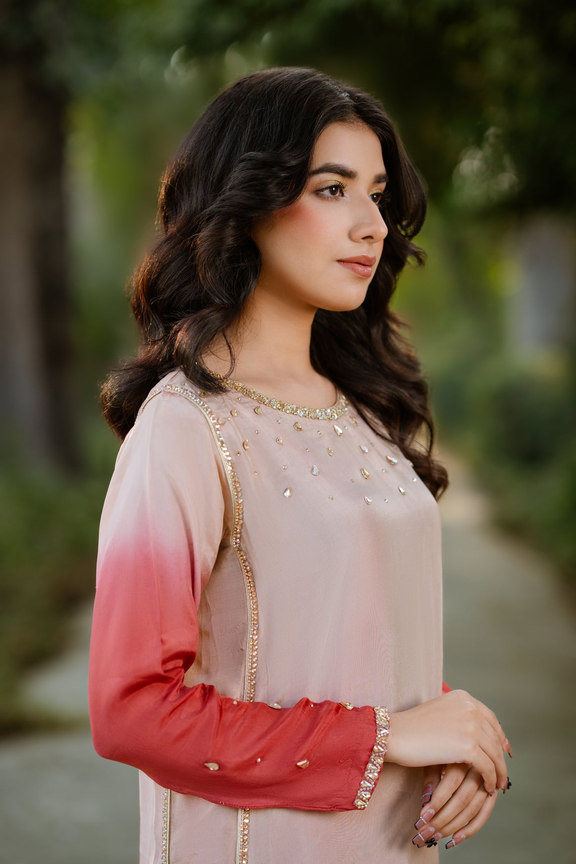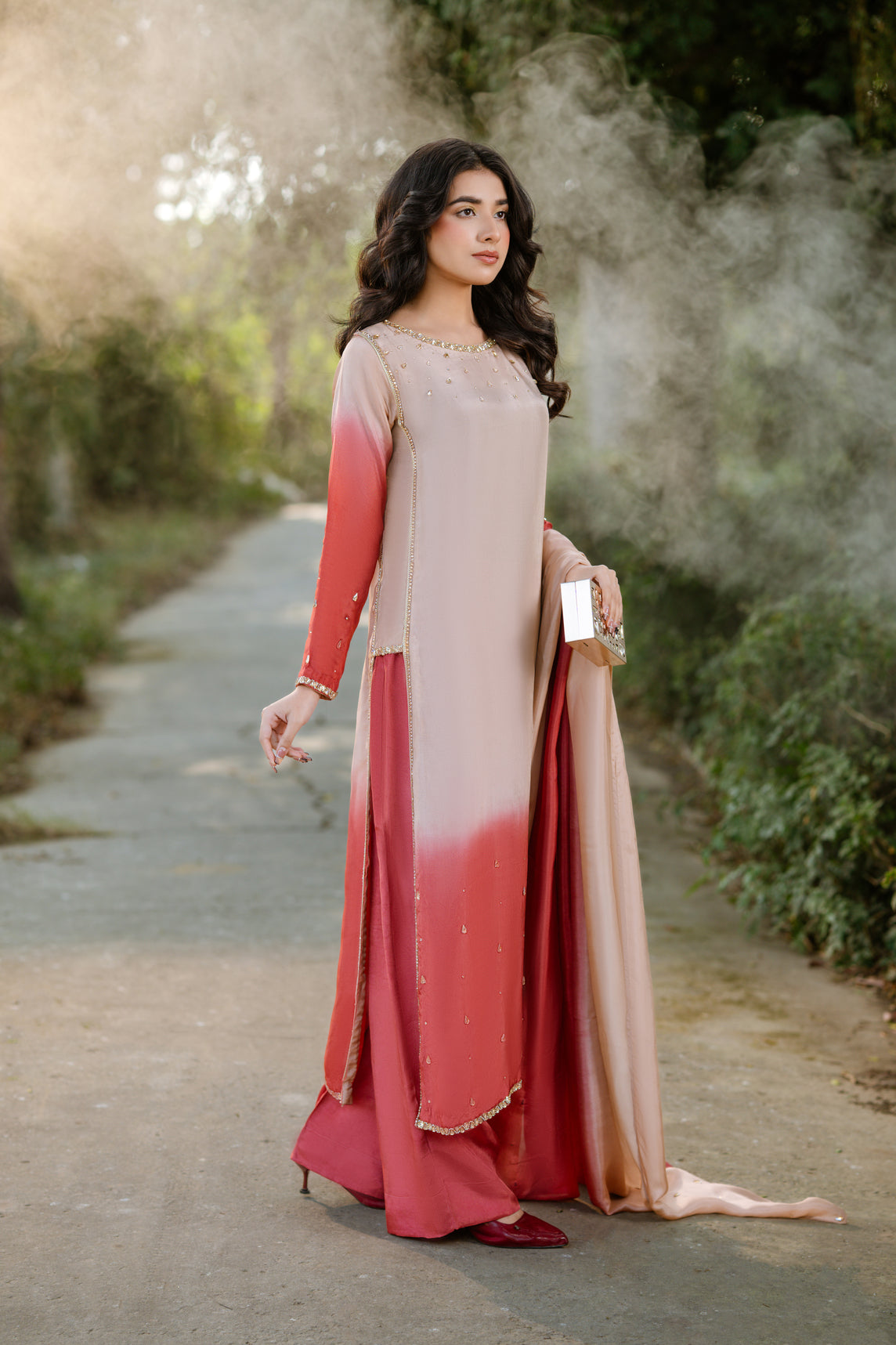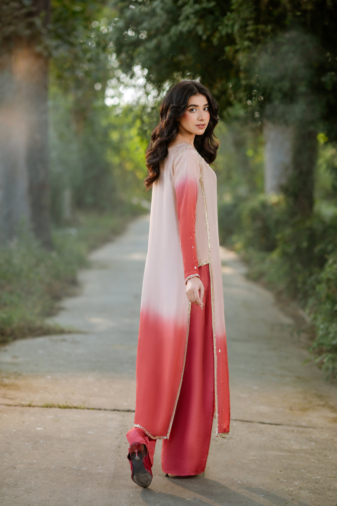 A glimpse of Chandni—this stunning soft pink ensemble from our luxury collection Dastak is a true embodiment of elegance and grace. The net frock is adorned with intricate crystal work throughout and is paired with a smooth tassel silk inner for a refined finish. Designed with a contrasting color band and a beautifully crafted V-neckline, the short frock features a stylish front cut that adds a modern edge. It is complemented by a luxuriously flared sharara crafted from tassel silk, offering graceful movement and volume. The net dupatta is thoughtfully designed with multiple panels, creating a majestic flare that enhances the overall silhouette. Perfect for festive celebrations and formal occasions, Chandni blends timeless charm with contemporary sophistication.